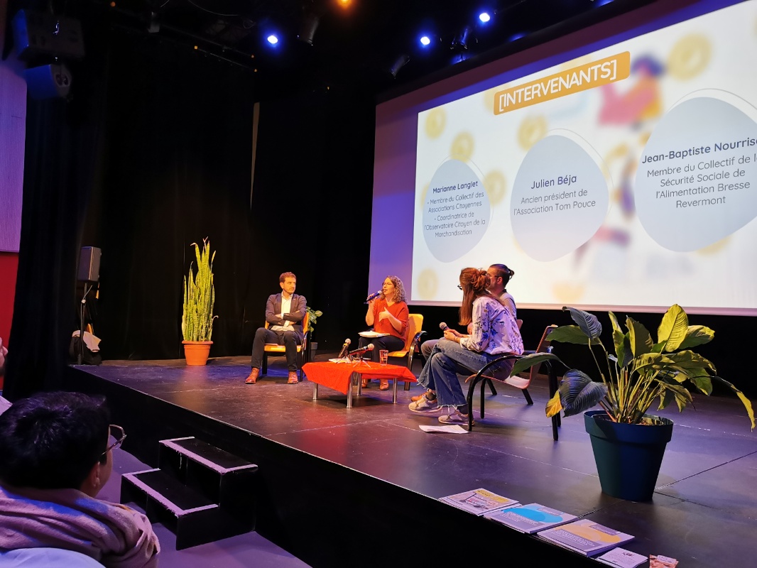 Jean-Baptiste Nourrison, membre du Collectif de la Sécurité Sociale de l’Alimentation Bresse Revermont, a montré qu’il est possible de sortir l’un des piliers des droits humains qu’est l’alimentation de la logique de marché, en s’inspirant du modèle de la Sécurité Sociale : cotisation et solidarité entre les membres.